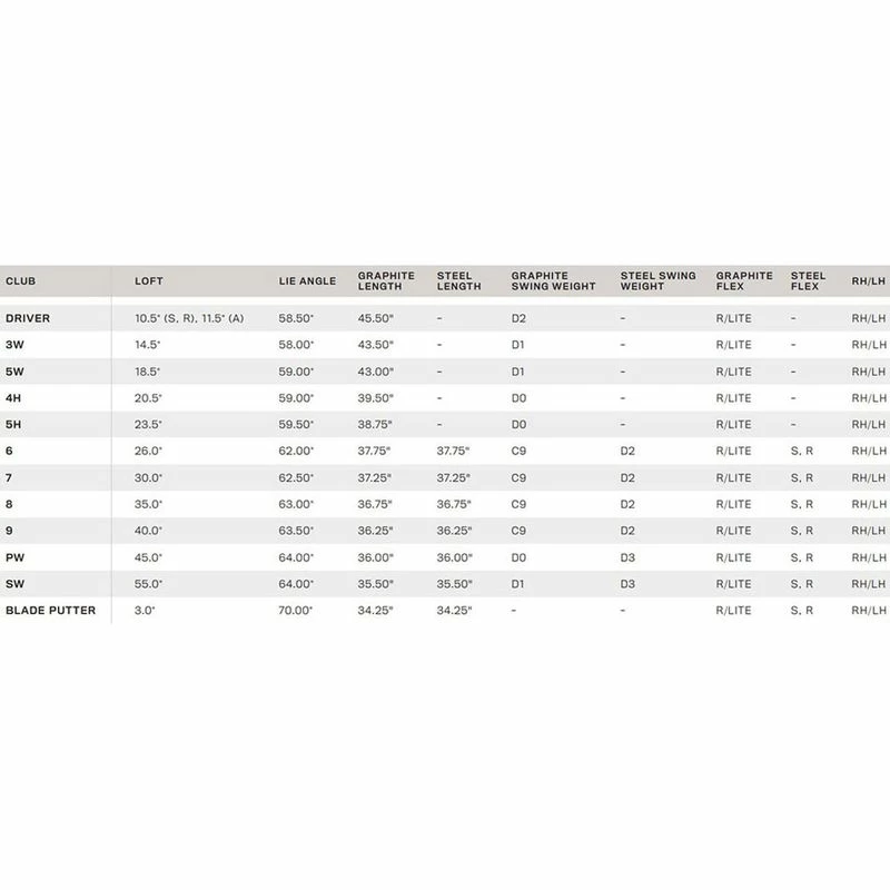 - Driver – A titanium driver (10.5* in stiff & regular or 11.5* in lite flex) has an oversized shape and heel-biased weighting for longer straighter drives.